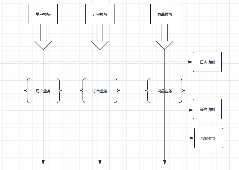 我们的业务流程方法都是自顶向下垂直的,而当我们需要给这些业务方法统一加上某些非业务功能的话,就会发现这些非业务功能方法在图上会连成一条直线,并与原来的业务流程方法垂直横切。