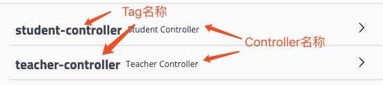 再次启动应用之后,我们就看到了如下的分组内容,代码中 @Api 定义的 tags 内容替代了默认产生的 teacher-controller 和 student-controller 。