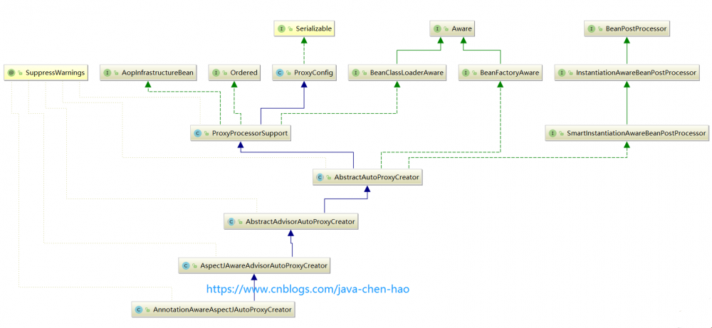 在上一篇的博文中我们讲解了通过自定义配置完成了对AnnotationAwareAspectJAutoProxyCreator类型的自动注册,那么这个类到底做了什么工作来完成AOP的操作呢?首先我们看看AnnotationAwareAspectJAutoProxyCreator的层次结构,如下图所示: