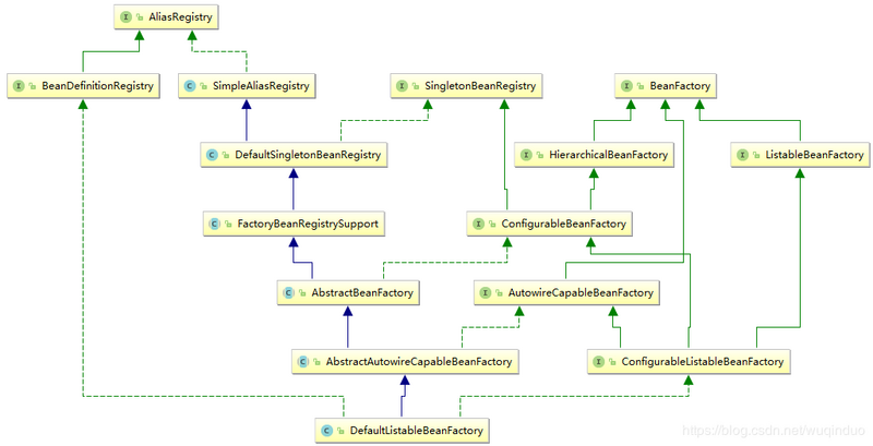 此图是默认容器DefaultListableBeanFactory的继承,实现关系图.我们从右向左来分析下.