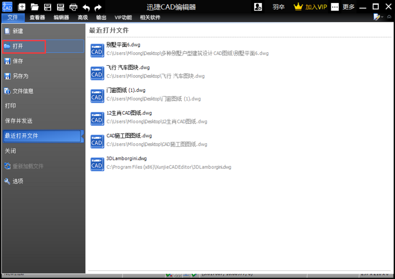 步骤一:在电脑桌面上安装好迅捷CAD编辑器,启动该软件进入到操作界面中后在点击左上方中的【文件】选项按钮,接着在选择【打开】按钮,界面会自动跳转到【打开】对话框中,打开其中一张CAD图纸文件后退出对话框。