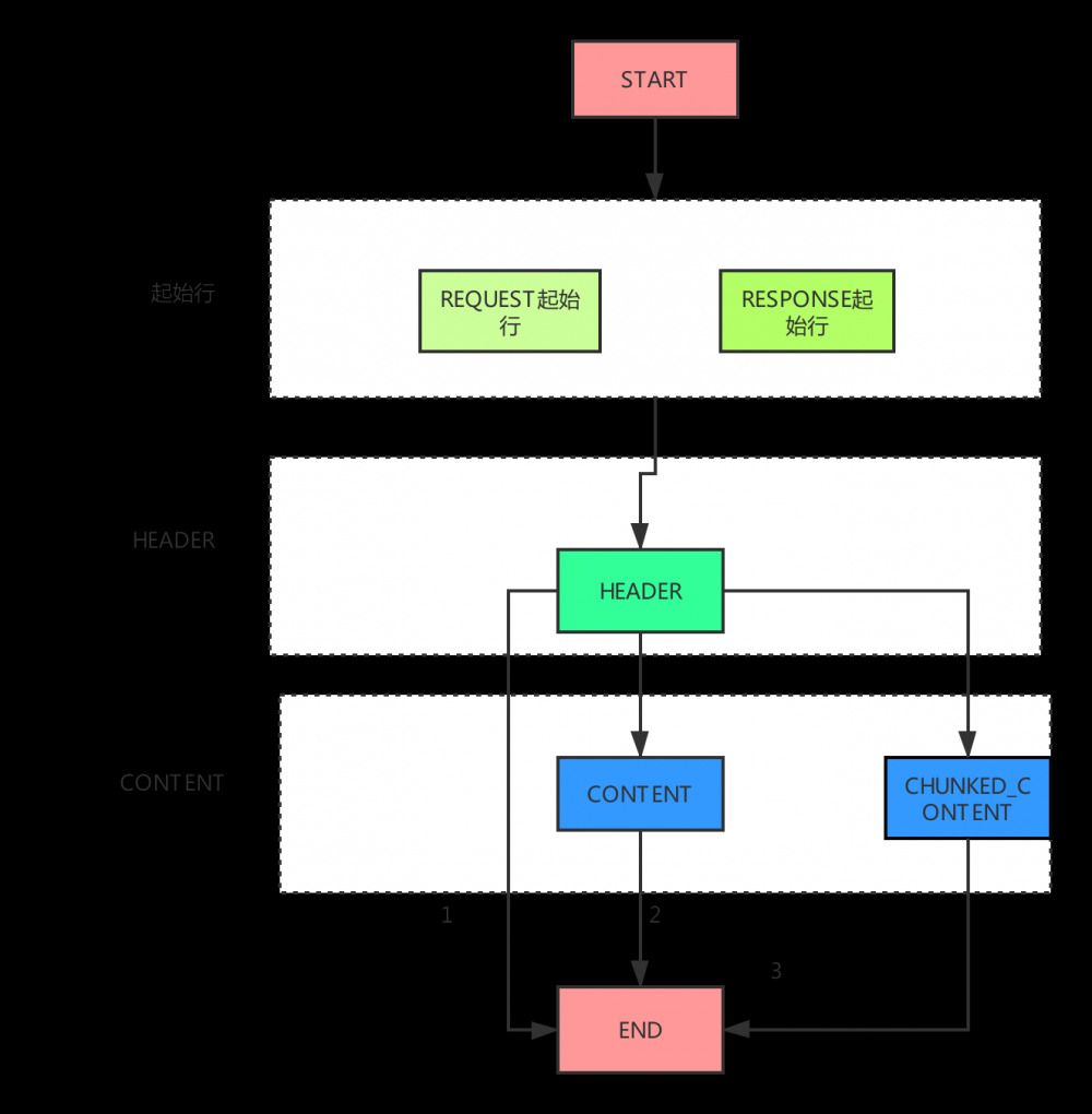 总共分成了21种状态,然后进行状态间的流转。在 parseNext 方法中分别对起始行 -> header -> body content分别解析