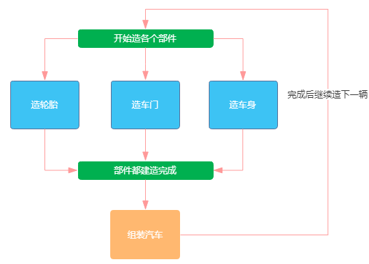 Start making car door... Start making tire... Start making car body... Making tire is finished. Making car door is finished. Making car body is finished. Start assemble car... Making assemble care is finished. Start making car body... Start making tire... Start making car door... Making car body is finished. Making tire is finished. Making car door is finished. Start assemble car... Making assemble care is finished. 复制代码