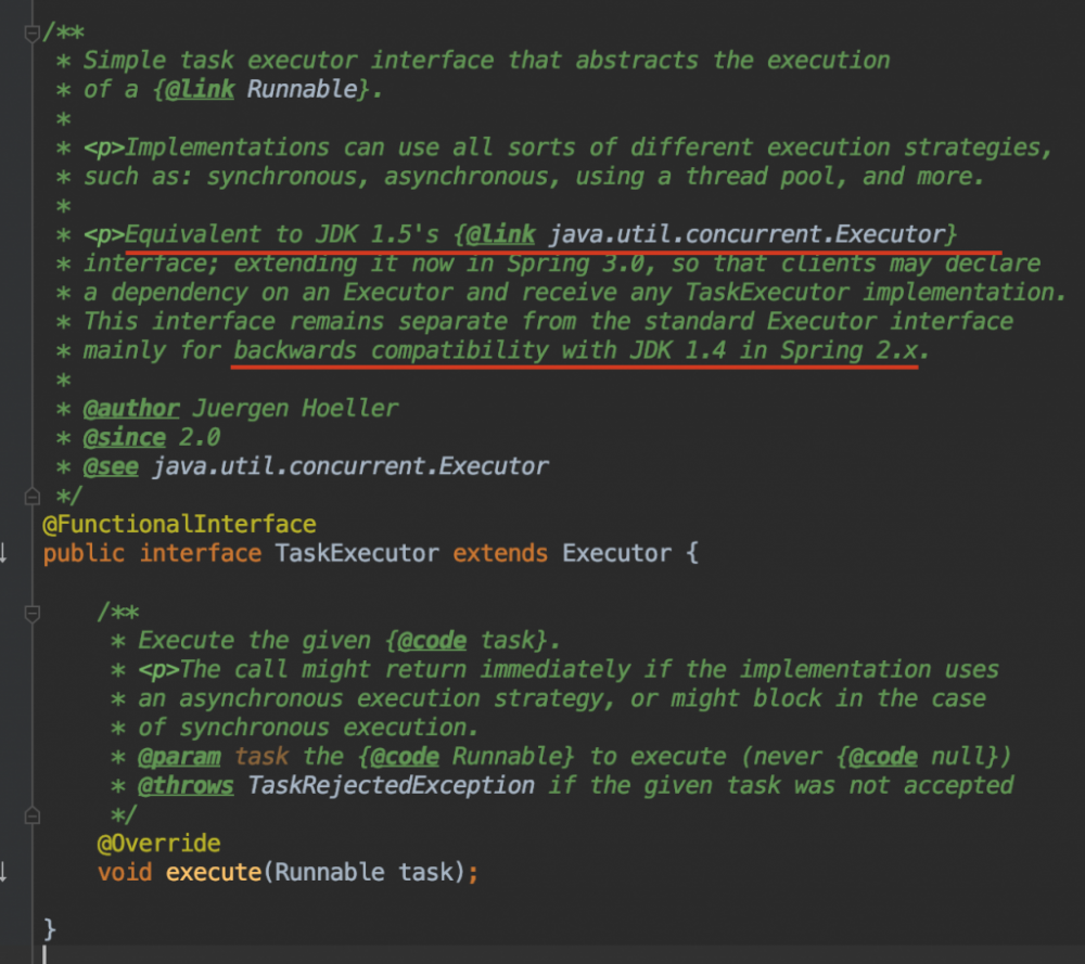 如果你对Java的线程池相关的API比较熟,那么在需要使用线程池的场景,你可能会用 Executors 来生成 ExecutorService (继承于 Executor ),从而执行任务。Spring中的 TaskExecutor 其实和Java的 Executor 是一样的,只不过后者是在Java 5的时候被引入的,Spring为了兼容之前的Java版本,自己搞了一套。时至今日,Spring已经最低要求Java 8了,但是为了兼容之前的Spring版本,还是保持了自己的API,基础的 TaskExecutor 接口已经直接继承于 Executor 了(如上图)。