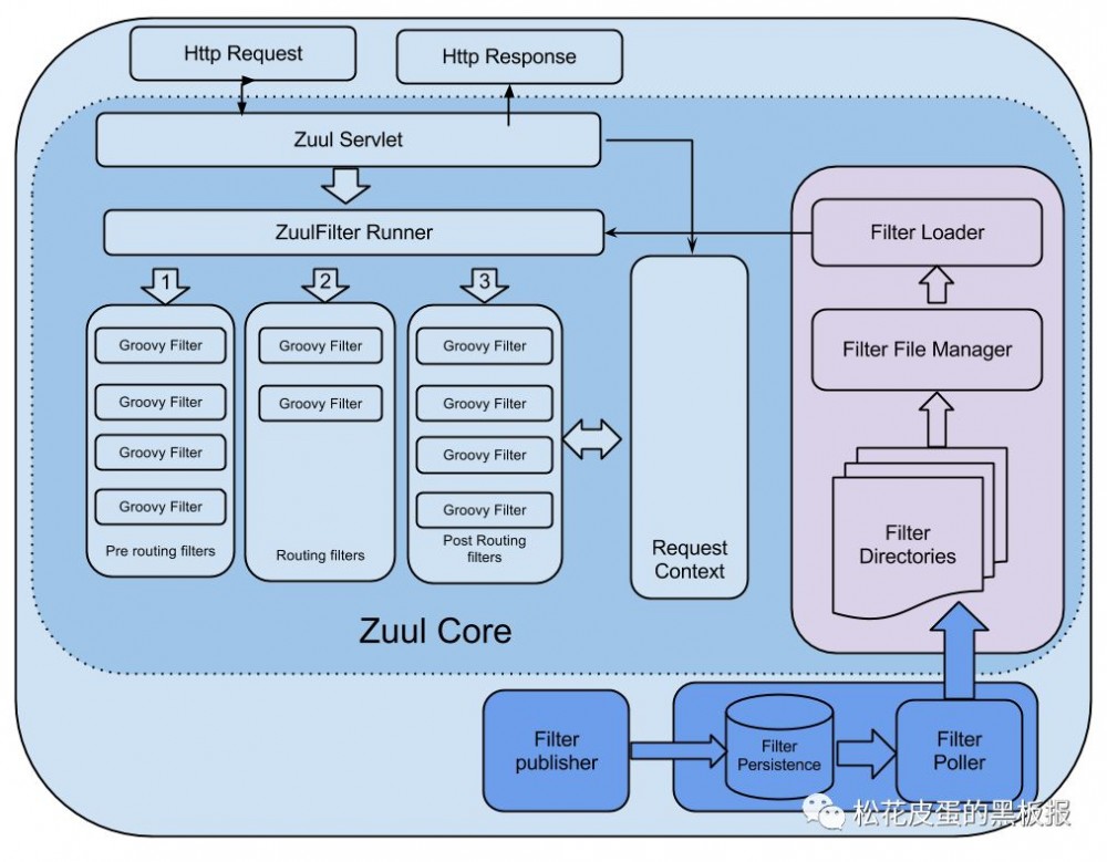 请求处理生命周期,"pre" filters(认证、路由、请求日记)->"routing filters"(将请求发送到后端)->"post" filters(增加HTTP头、收集统计和度量、客户端响应)