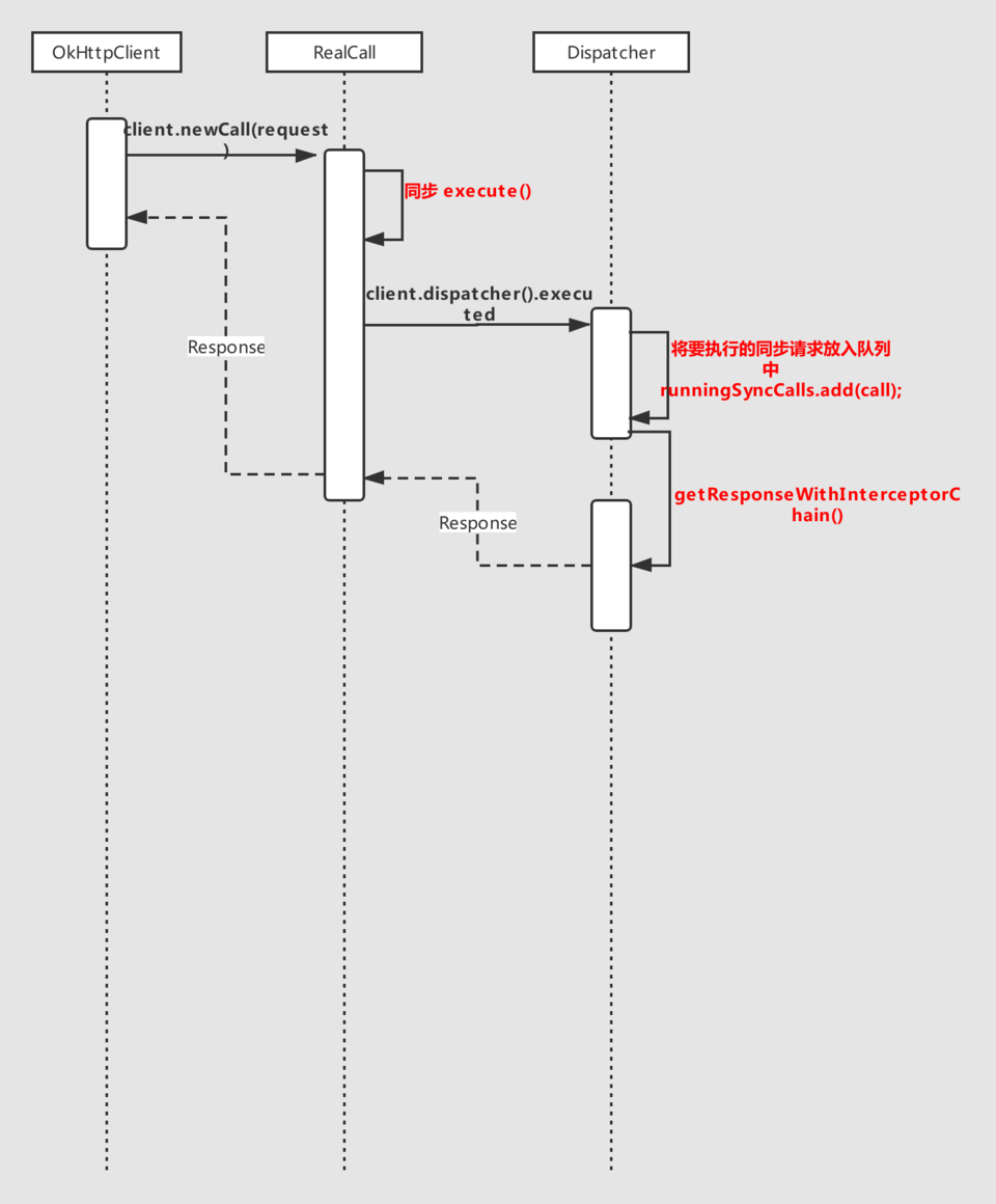 Dispatcher.executed() 中的 runningSyncCalls 将 Realcall 添加到同步执行队列中 getResponseWithInterceptorChain() 内部的责任链调用对 Request 层层处理包装,最后在 CallServerInterceptor 拦截器中发起请求和获得 Response Dispatcher.finished() ,把 call 实例从队列中移除,并执行下一次任务。 创建 OKHttpClient 实例,配置属性