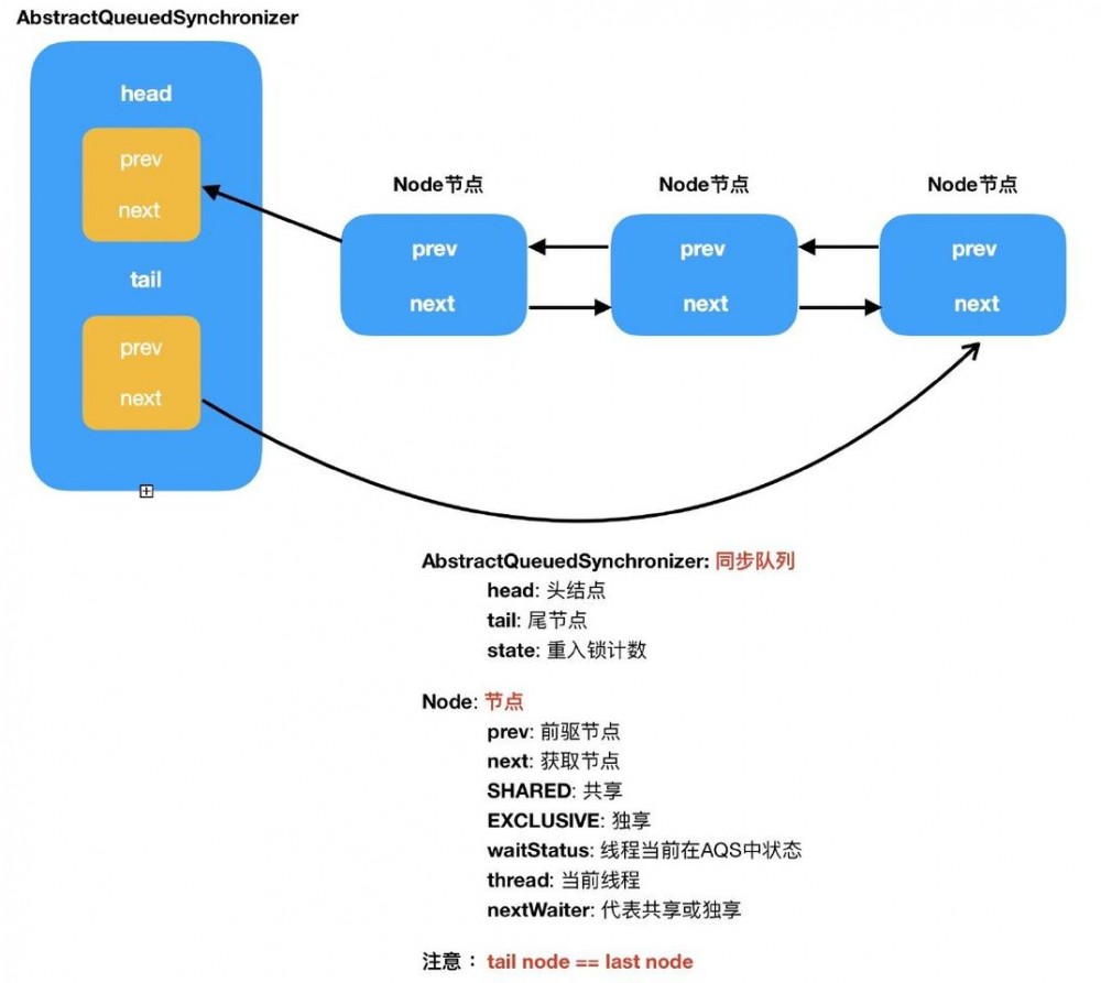 在分析源代码之前,先来看一张图来了解一下 AQS排队同步队列 和 Node 节点中的 waitStatus 状态 。