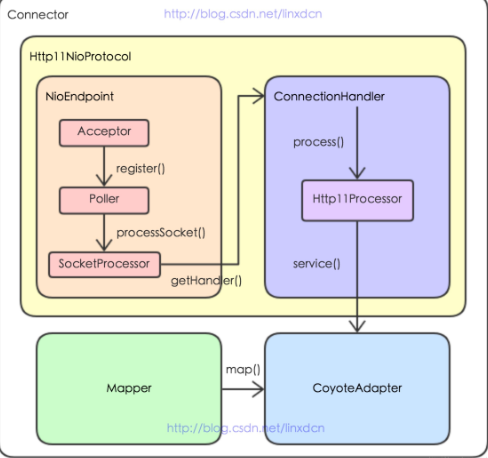 Connector主要包含三个模块: Http11NioProtocol(Endpoint+processor) , Mapper , CoyoteAdapter ,http请求在Connector中的流程如下