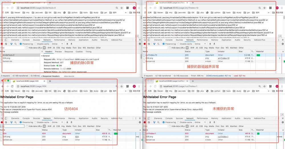 实例测试如下,上面我们声明捕获的两种异常被拦截并输出对应的堆栈信息;