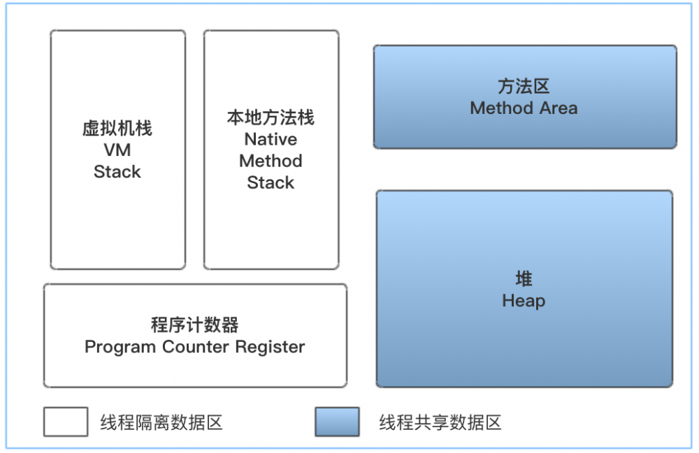 常见的内存划分为:虚拟机栈、本地方法栈、程序计数器、方法区、堆