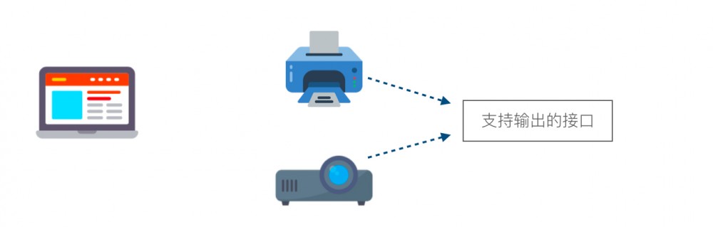 举个例子,现实生活中,我们想要通过一台计算机把文档或者图片投影到幕布上,同时也需要能通过打印机打印出来,那么投影仪和打印机两台输出设备必须具备支持信息输出的接口。