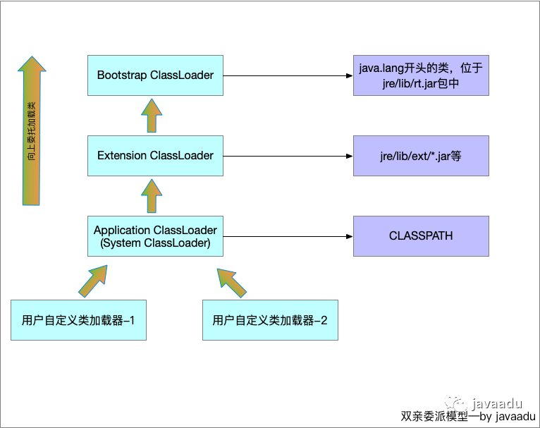 从Java开发者的角度看,需要了解类加载器的双亲委派模型,如下图所示: