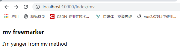 启动项目,分别访问http://localhost:10900/index/hello和http://localhost:10900/index/mv,可以看到已经可以展示页面信息了。