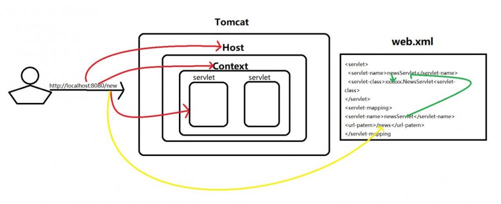 具体我再配合图中解释一下: 找到了指定的 web 应用之后,通过请求的路径 /news 去 web.xml 中寻找是否有对应的 标签,其中这个标签的子标签 标签的值需要匹配到请求的路径,这个时候 标签的值为 /news 正好匹配到了,所以我们获取了上面的标签的值然后再寻找是否有 标签的子标签 和这个值相等,如果有则获取到底下的 对应的类 并通过这个类去解析请求