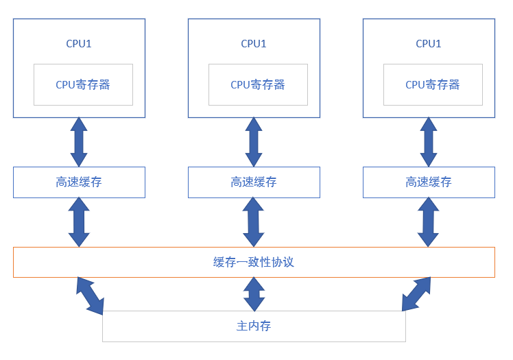 当多个处理器要使用和修改主内存中同一块区域时,可能会导致不同处理器中的数据不一样,如何将不同CPU寄存器、高速缓存中的数据进行同步,保证数据的一致性,运算的正确性的同时保证处理器的效率是设计着需要考虑的问题。在硬件上,各个处理器都遵循了各自的一致性协议,来解决这些问题