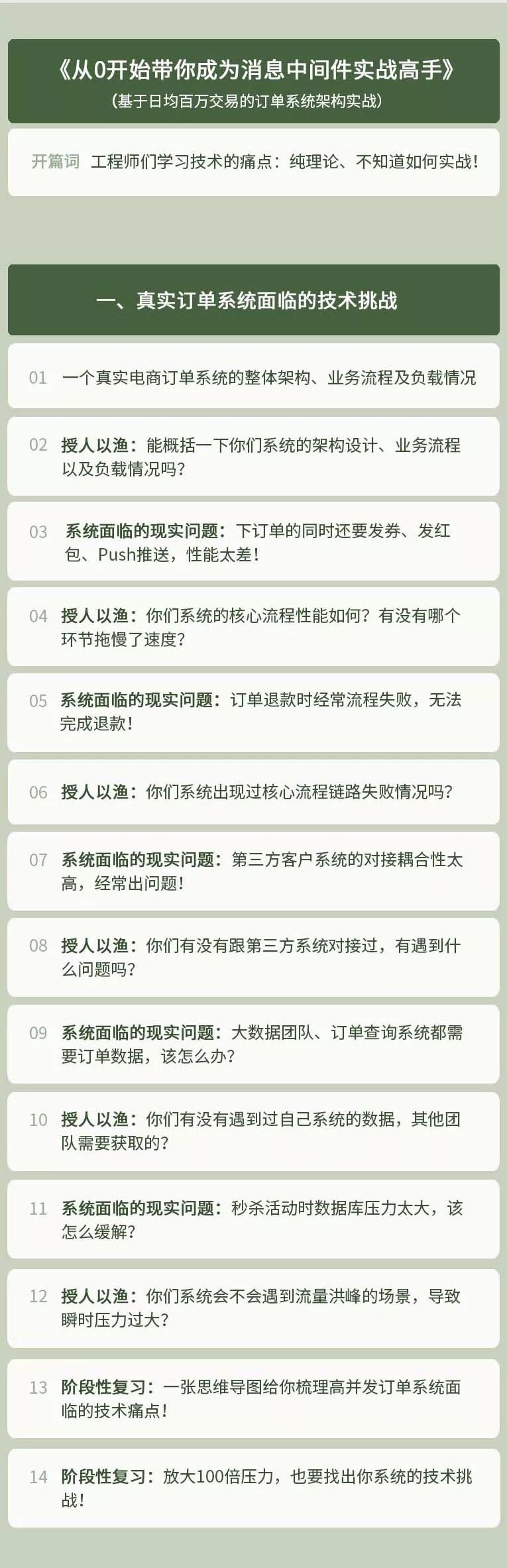 1、 从一个真实的 日均百万级交易量的订单系统 出发,反向驱动出各种技术的学习来解决生产中的问题。