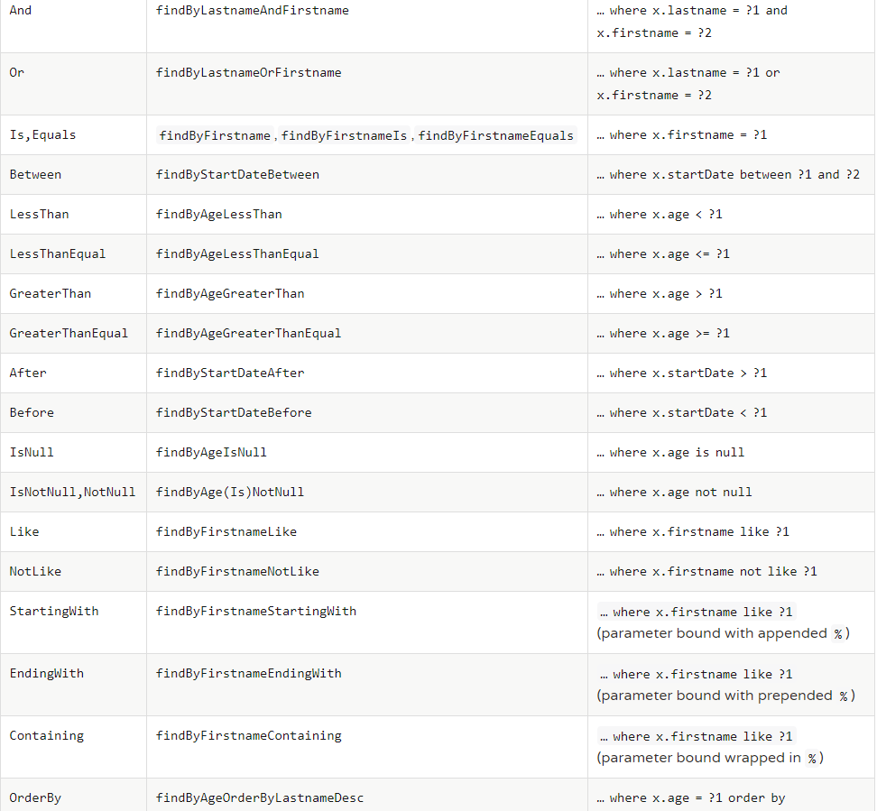 The following table describes the keywords supported for JPA and what a method containing that keyword translates to: