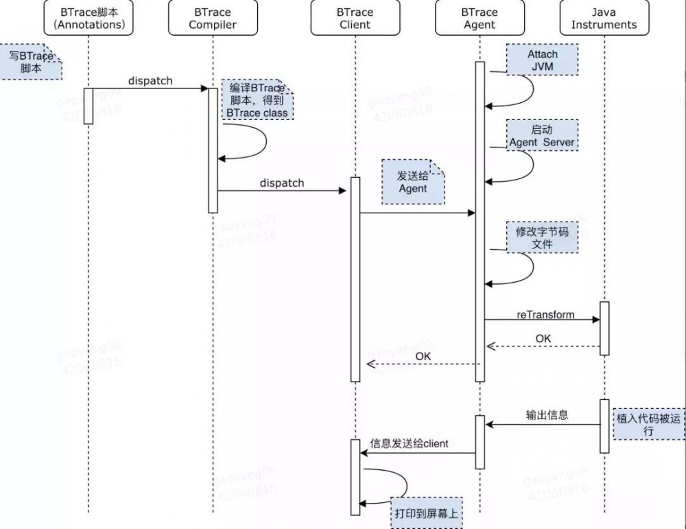 4、Agent:基于Java的Attach API,Agent可以动态附着到一个运行的JVM上,然后开启一个BTrace Server,接收client发过来的BTrace脚本;解析脚本,然后根据脚本中的规则找到要修改的类;修改字节码后,调用Java Instrument的retransform接口,完成对对象行为的修改并使之生效。