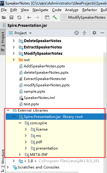 方法 1 :通过官网 下载JAR 文件包。下载后,解压文件,并将lib文件夹下的Spire.Presentation.jar文件导入到java程序。参考如下导入效果: