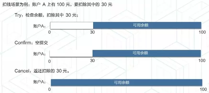 try-冻结30元,预留资源 --> confirm-扣款30元 --> cancel-退回30元。