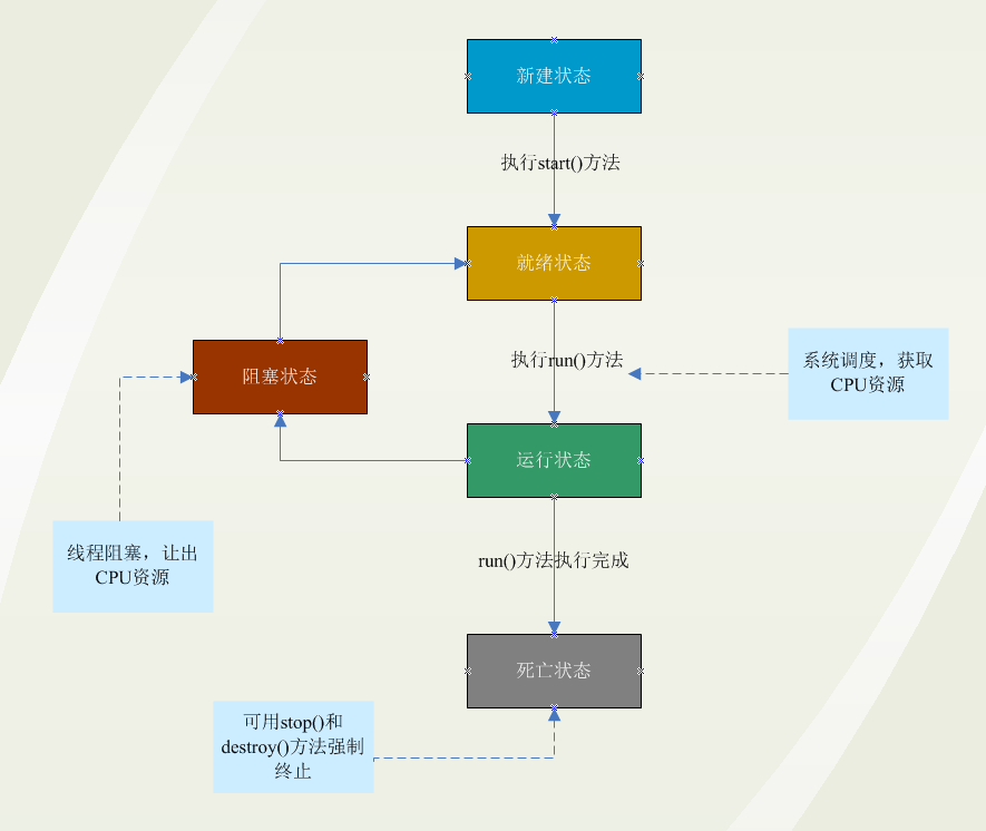 其他阻塞:通过调用线程的 sleep() 或 join() 发出了 I/O 请求时,线程就会进入到阻塞状态。当sleep() 状态超时,join() 等待线程终止或超时,或者 I/O 处理完毕,线程重新转入就绪状态。