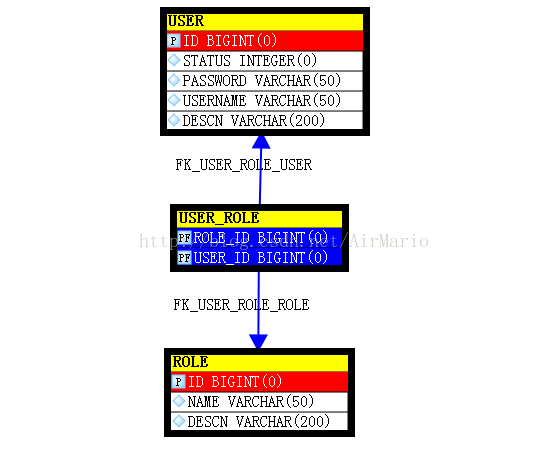 这里还是用的mysql数据库,所以pom.xml文件都不用修改。这里只要新建三张表即可,user表、role表、user role表。其中user用户表,role角色表为保存用户权限数据的主表,user role为关联表。user用户表,role角色表之间为多对多关系,就是说一个用户可以有多个角色。ER图如下所示: