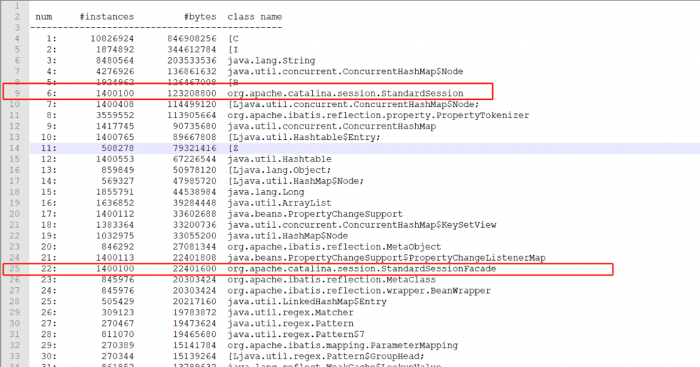 > jmap -hive 19793 num #instances #bytes class name ---------------------------------------------- 1: 37494 76896680 [I 2: 25378 20727448 [B 3: 171462 19284664 [C 4: 141175 3388200 java.lang.String 5: 561 2513408 [Ljava.util.concurrent.ConcurrentHashMap$Node; 6: 77525 2480800 java.util.HashMap$Node 7: 38859 2247400 [Ljava.lang.Object; 8: 20021 1761848 java.lang.reflect.Method 9: 14842 1651912 java.lang.Class 10: 51005 1632160 java.util.concurrent.ConcurrentHashMap$Node 11: 18588 1567464 [Ljava.util.HashMap$Node; 12: 29526 1181040 java.util.LinkedHashMap$Entry 13: 13645 764120 java.util.LinkedHashMap 14: 36894 763928 [Ljava.lang.Class; 15: 22800 729600 com.mysql.cj.conf.BooleanProperty 16: 14720 706560 java.util.HashMap 17: 37818 605088 java.lang.Object 18: 18016 432384 java.util.ArrayList 复制代码