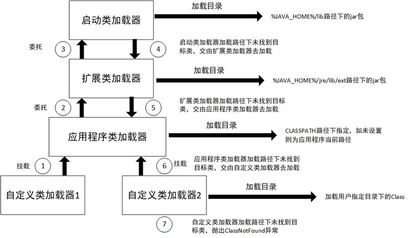 双亲委派过程:当一个类加载器收到类加载任务时,立即将任务委派给它的父类加载器去执行,直至委派给最顶层的启动类加载器为止。如果父类加载器无法加载委派给它的类时,将类加载任务退回给它的下一级加载器去执行。