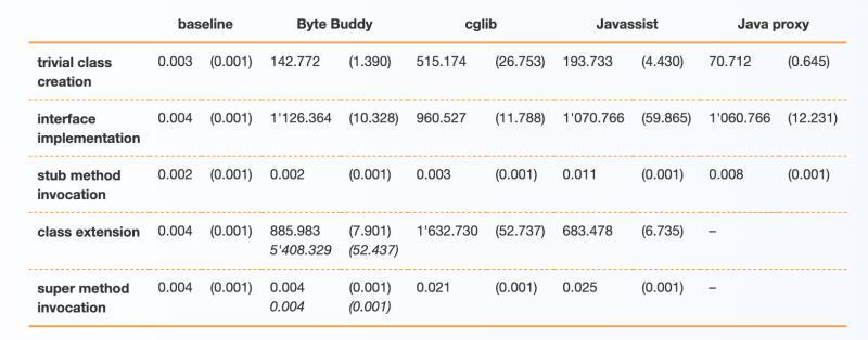 图中的每一行分别为,类的创建、接口实现、方法调用、类型扩展、父类方法调用的性能结果。从性能报告中可以看出,Byte Buddy 的主要侧重点在于以最少的运行时生成代码,需要注意的是,我们这些衡量 Java 代码性能的测试,都由 Java 虚拟机即时编译器优化过,如果你的代码只是偶尔运行,没有得到虚拟机的优化,可能性能会有所偏差。所以我们在使用 Byte Buddy 开发时,我们希望监控这些指标,以避免在添加新功能时造成性能损失。