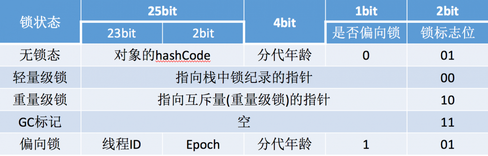 可以看出,对象状态一共有五种:无锁、轻量级锁、重量级锁、GC标记和偏向锁。