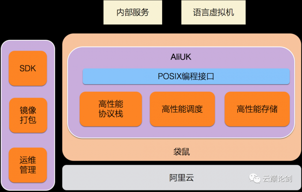 AliUK(Alibaba Unikernel)是阿里云操作系统团队一个探索性项目,基于开源Unikernel技术,结合阿里巴巴业务特点而设计的Unikernl方案。瞄准阿里巴巴业务高性能诉求,提供高性能Unikernel方案。AliUK是面向Serverless的“微安全服务”场景的下一代多种运行单元中之一。