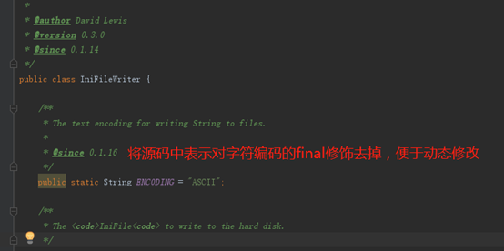 首先,对于字符的问题,作者是在 IniFIleWriter 类中定义了一个表示字符的常量,去掉 final 修饰符,便于使用过程中动态修改编码: