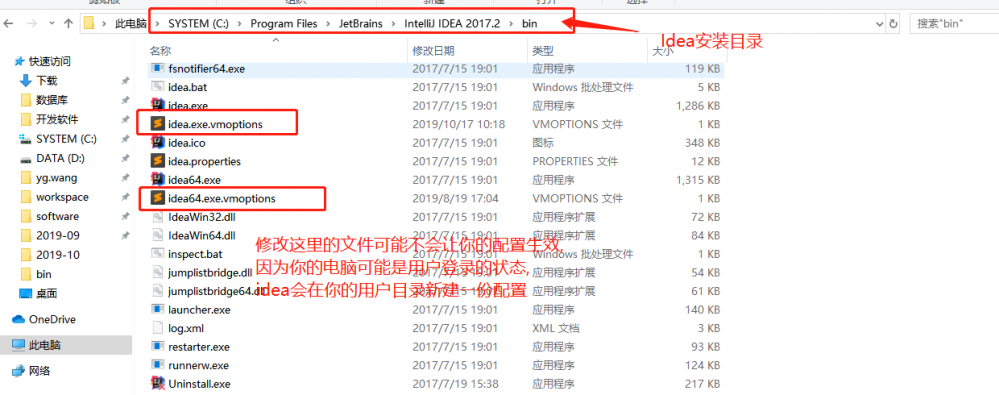 windows是基于用户登录的,idea会为每个用户在当前用户根目录下创建一份配置信息,所以在idea安装目录下修改idea.vmoptions是不生效的,如图: