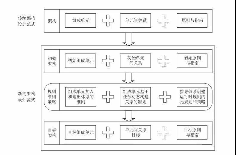 这样,就把复杂体系架构设计的重点从组成单元、单元关系转到了规则、准则和策略的设计上,如图 1所示。