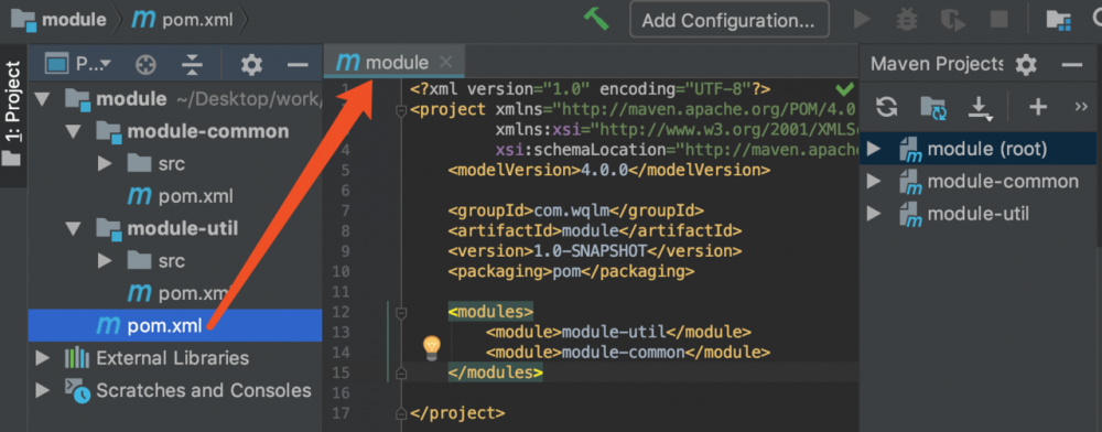 每个 module 都有一个值,注意这个值是要聚合的maven项目相对于该 pom 文件的路径名称,而非 module 的 artifactId