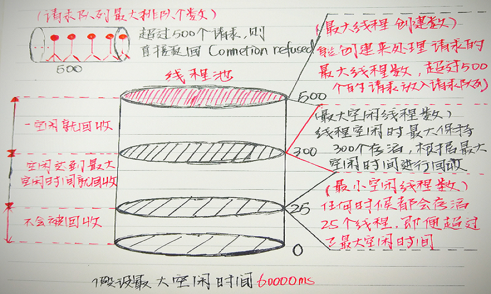 maxIdleTime:最大空闲时间,超过这个空闲时间,且线程数大于minSpareThreads的,都会被回收,默认值1分钟(60000ms);