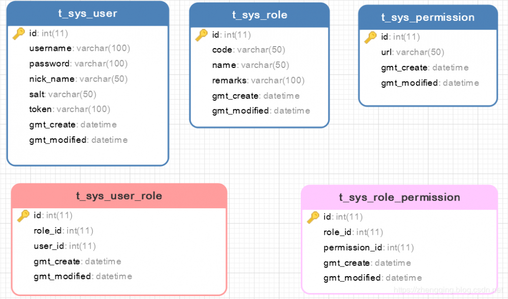t_sys_user 关联 角色表 t_sys_role 两者建立中间关系表 t_sys_user_role t_sys_role 关联 权限表 t_sys_permission 两者建立中间关系表 t_sys_role_permission 温馨小提示:这里逻辑根据个人业务来定义,小编这里讲解案例只给用户对应的角色分配访问权限,像其它的 直接给用户分配权限等等可以自己实现