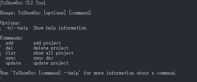 toshowdoc add 添加一个项目 toshowdoc update 更新项目信息 toshowdoc del 删除一个项目 toshowdoc list 显示项目集合 toshowdoc sync 同步项目文档 toshowdoc -h 显示帮助信息