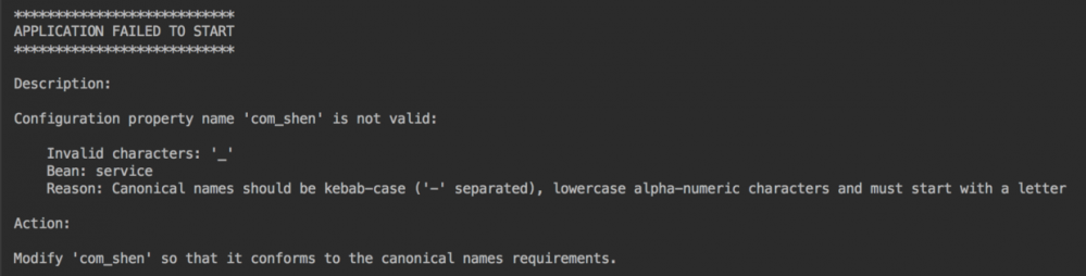 结合报错日志,我们可以很容易的解决这个问题,去掉配置项中的 _ ,将配置项name修改为 com.shen.name 即可。