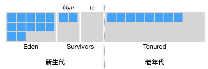 按照上文所述,JVM 将堆划分为新生代和老年代,其中,新生代又被划分为 Eden 区,以及两个大小相同的 Survivor 区。