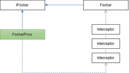 如果注册服务时提供的是一个接口和它的实现类型,我们会按照如下的方式来生成可被拦截的代理类型。假设接口和实现类型分别为IFoobar和Foobar,那么我们会生成一个同样实现IFoobar接口的FoobarProxy类型。FoobarProxy对象是对Foobar对象的封装,对于它实现的方法来说,如果没有拦截器应用到Foobar类型对应的方法上,它只需要调用封装的这个Foobar对象对应的方法就可以了。反之,针对拦截器的调用将会注入到FoobarProxy实现的方法中。