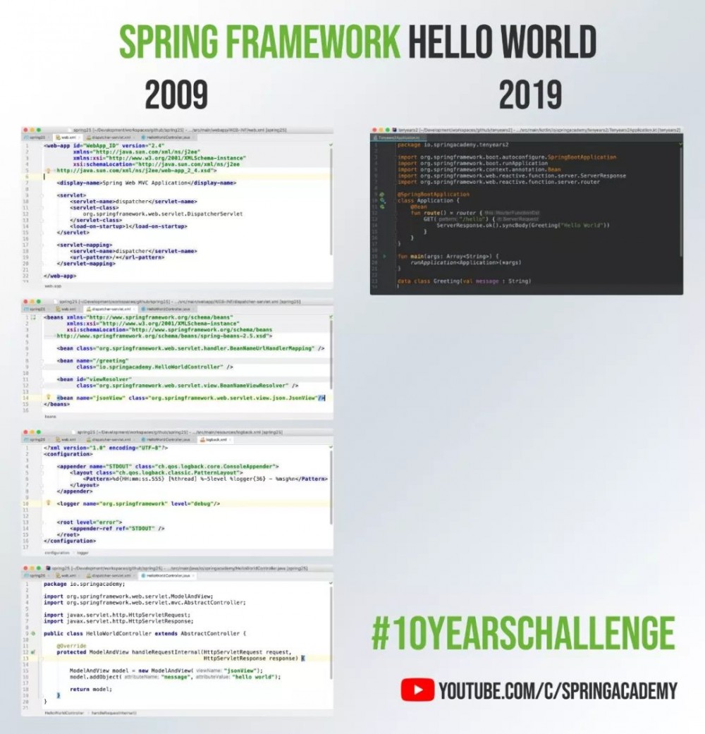 2014 年,Spring Boot 1.0 发布。 Spring Boot 的发布绝对是 Pivotal 历史上具有里程碑意义的事件,它让我们能够非常简便地开发 Spring 应用,屏蔽了各种配置文件和底层实现,提供 AutoConfiguration,Factory Loading Mechanism, Embedded Servlet Container,Conditional Annotation 等诸多特性。 目前围绕着 Spring Boot 的生态项目已经太多了,包括 Spring Cloud,Spring Cloud Gateway,Spring Initializr,Spring Cloud Stream, Spring Cloud Data Flow。 周边几乎所有的第三方开源项目都创建了 Spring Boot 对应的 Starter: Kafka Starter,RabbitMQ Starter,MyBatis Starter,Dubbo Starter。