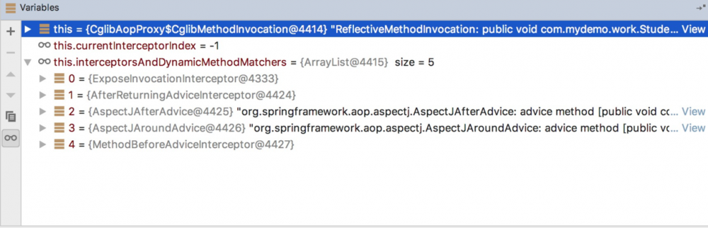 可以看到,确实是 LogAspect 的通知先执行了,这是为什么呢?我们来debug源码看一下,主要看拦截器链,如图:
