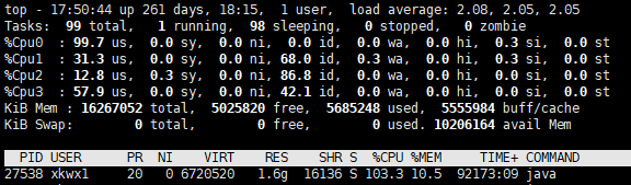 首先是在服务器上用top命令查看服务器状态,发现有一个应用程序占用的CPU时长超过100%,如图: