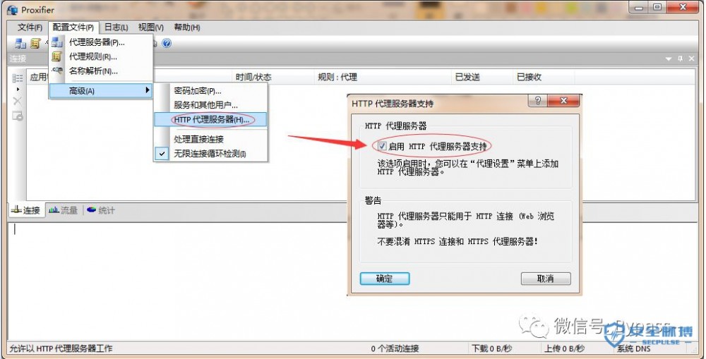 打开软件,依次选择,配置文件-->高级-->HTTP代理服务器-->启用HTTP代理服务器支持。