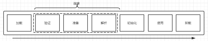 JVM中类的生命周期包括7个阶段,加载、准备、验证、解析、初始化、使用、卸载。其中准备、验证、解析被归为连接阶段。