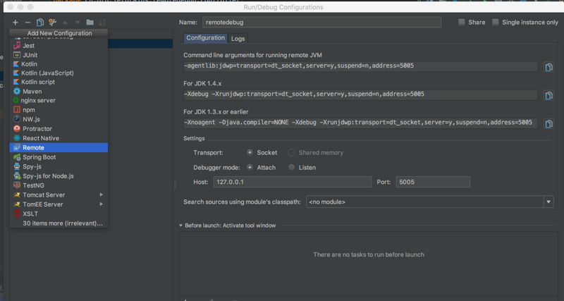 -Xdebug -Xrunjdwp:transport=dt_socket,server=y,suspend=n,address=5005