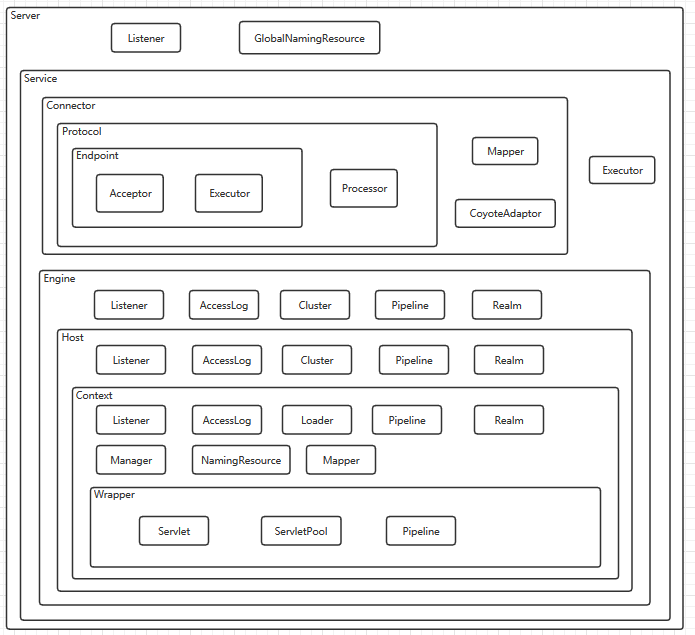 Server组件代表整个Tomcat容器,是Tomcat最外层的组件,它包括三个部分:生命周期监听器,全局命名资源,Service组件