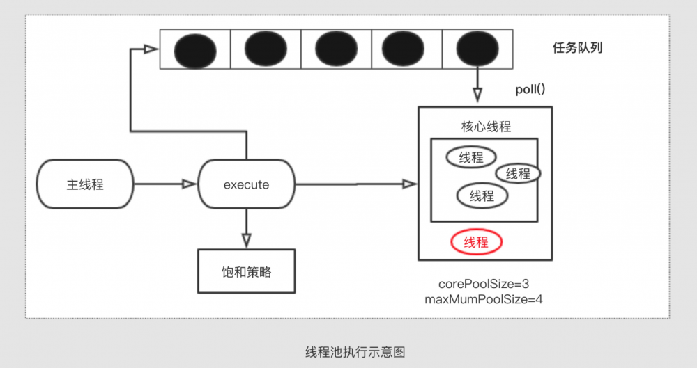 5) RejectedExecusionHandler 饱和策略。如果我们的任务队列满了,并且线程池里的线程数量已经达到了最大线程数,而且这些线程都不再空闲状态。这时候新提交任务的话,无法去执行,所以需要一种饱和策略来去处理这些任务。Java提供了一下几种策略